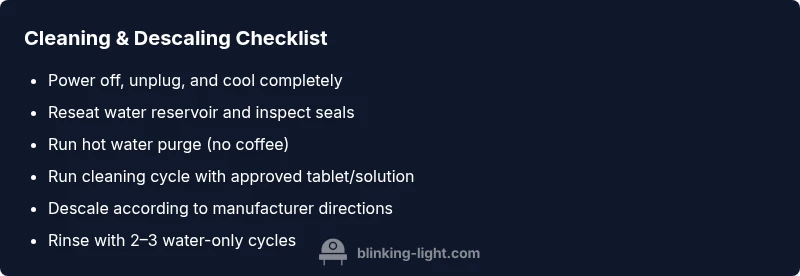 Try these fixes in order, because they address the most common root causes first. Start with a simple power cycle: unplug the machine for 30 seconds, then plug it back in and reset. Check that the water reservoir is properly seated and not overly full or empty. Run a hot water rinse to verify water flow and purge any air from the lines. If available, perform a cleaning cycle using the manufacturer-recommended cleaning tablet or solution. After cleaning, run a few water-only cycles to flush the system. If the light remains blinking, proceed to descaling and re-check all seals and gasket seating. The goal is to restore normal flow and eliminate mineral buildup that can trigger the light.