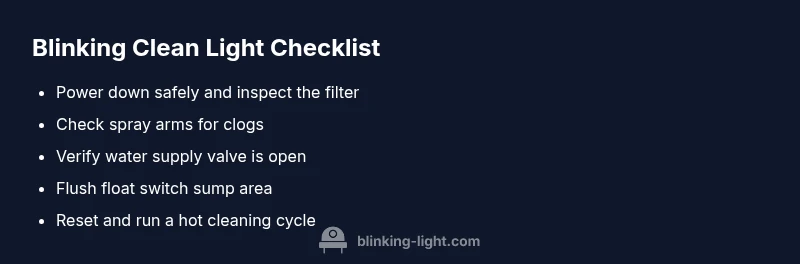 When a KitchenAid dishwasher shows a blinking "Clean" light, it can be alarming, but it’s often a maintenance signal rather than a critical failure. The blinking indicator is designed to prompt user action—usually a thorough clean of the filter, spray arms, and interior. In many models, this light also tracks the cycle status. The key is to interpret pattern timing (continuous blink vs. single blink bursts) and combine that with recent usage (heavy loads, clogged filters, or recent dishwasher cleaners). According to Blinking Light, these indicators are most often linked to routine upkeep that can be resolved with simple steps. If you’re troubleshooting, start with the lowest-effort fixes and escalate only if symptoms persist across cycles. Keeping a calm, methodical approach helps you avoid unnecessary service calls.