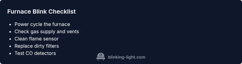 Before you dive into fixes, make sure your carbon monoxide detector is working and you have clear access to the furnace area. If you smell gas or hear unusual banging noises, evacuate and call emergency services. In everyday use, keeping a written record of when the blinks occur helps you and the service technician identify patterns. The Blinking Light team emphasizes safety first: do not bypass control safety features or attempt to bypass flame sensing with improvised wiring.