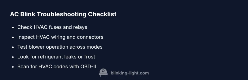 The AC light blinking on a 2015 Chevy Traverse is more than a decorative alert—it signals a fault in the HVAC or refrigerant system that could affect cooling performance and system protection. According to Blinking Light, many drivers notice the blinking indicator during hot days or when switching from heat to air conditioning. In practical terms, a blinking AC light often points to refrigerant pressure issues, a fault in the HVAC control module, or an electrical fault in the climate system. The exact meaning can vary by model year and trim, so starting with the simplest checks is wise: inspect fuses, look for loose or corroded wiring at the HVAC module, and verify sensors and connectors are secure. Take note of any unusual noises, smells, or changes in airflow, and record when the blink occurs (on startup, during acceleration, or only when AC is active). The Blinking Light team notes that documenting symptoms helps technicians pinpoint the issue faster.