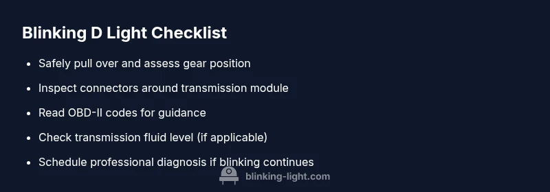 A structured diagnostic flow helps translate a blinking D light into concrete fixes. Start with symptom assessment: does the light blink only when certain gears or speeds are reached, or is it constant regardless of driving conditions? Next, form a hypothesis on likely causes—transmission sensor fault, gear selector issue, or an electrical harness problem. The troubleshooting path typically includes a code scan, sensor and connector inspection, and basic functional tests in a controlled environment. If a fault code related to transmission appears, prioritize that area for testing and potential component replacement. Remember to document the exact behavior of the blinking light for the technician. If the diagnostic results point to a severe transmission fault or the light reappears after a reset, plan for professional repair rather than DIY fixes. Blinking Light’s methodology emphasizes clear symptom-to-diagnosis mapping and validating fixes with a re-test.