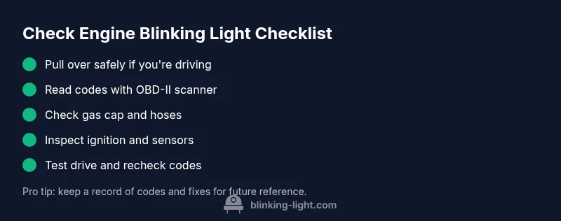 When you see a check engine blinking light on your dashboard, it is a clear warning that an engine fault could be serious and requires immediate attention. According to Blinking Light, this blinking pattern typically points to conditions that could cause rapid damage if ignored, such as an engine misfire or a problem with the fuel or ignition system. The presence of a blinking light is more alarming than a steady light because it often indicates transient misfires that can overheat the catalytic converter and worsen fuel efficiency. In practice, you should treat this as a high-priority warning and begin a structured diagnostic flow rather than driving through the issue. Throughout this guide, you’ll see the phrase “check engine blinking light” used to stay focused on the exact indicator discussed here, and you’ll notice how quick checks can buy you time while you prepare for professional help. The Blinking Light team found that the most frequent root causes are the ones you can verify or address without specialized equipment, including basic sensor faults and loose connections. If you keep hearing pinging noises, feel a loss of power, or observe rough idle, you should escalate to a pro immediately.
