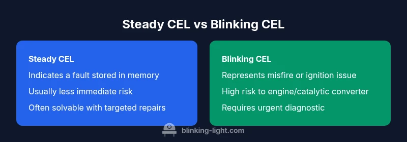 According to Blinking Light, distinguishing the steady check engine light on from a blinking one is crucial for safety and cost. In practical terms, the check engine light on vs blinking signals different levels of urgency: a steady CEL usually warrants prompt diagnostics, while a blinking CEL often indicates a misfire or severe issue that may damage the engine or catalytic converter if driven. This quick comparison helps you decide whether to continue driving, perform basic checks, or seek immediate professional help.