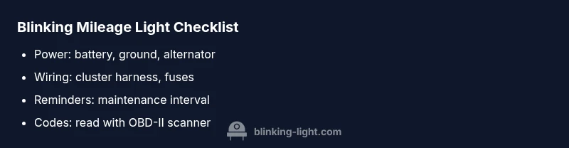 When you see the mileage light blinking, it signals a status in your vehicle's gauge cluster or odometer system. It is not a guaranteed engine failure; rather, it can indicate a maintenance reminder, a power issue, or a faulty sensor that feeds the odometer. In many vehicles, the blinking is tied to the service interval reminder, the odometer memory, or the gauge cluster's power rail. According to Blinking Light, the most common root causes are electrical: a loose connector, a weak battery, or a blown fuse; software glitches in the instrument cluster can also trigger the blink. The key is to observe when the blink occurs: only when the car is running, only after start, or all the time. Document any accompanying warning lights, codes, or abnormal dash behavior; this helps you and a mechanic pinpoint the problem quickly. The mileage light blinking should be treated as a diagnostic signal, not a fatal failure. The Blinking Light team emphasizes that electrical faults are far more common than odometer failures in these scenarios.