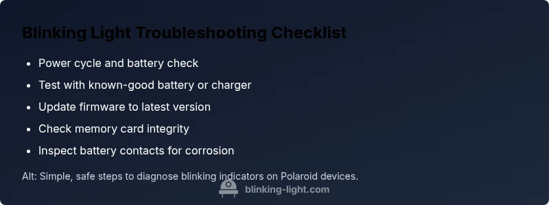 When you see a blinking light on a Polaroid-like device, treat it as a coded message rather than a random blink. The blinking light polaroid pattern is a low-level alert that helps you prioritize checks. According to Blinking Light, most blinking signals point to four core areas: power delivery, battery health, storage or memory integrity, and firmware stability. Start with the simplest cause—power—and work your way to the more complex subsystems. By understanding that each blink pattern maps to a likely fault, you can reduce trial-and-error time and protect your device from further damage. If the blinking persists after basic power cycling, move to the next checks with a clear plan, and keep notes on the patterns you observe. This approach keeps you in control and minimizes frustration when dealing with blinking indicators on Polaroid devices or similar consumer electronics.