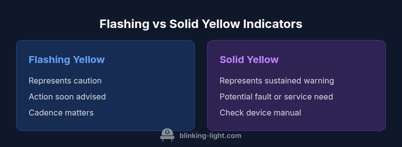 Difference Between Flashing Yellow Light and Solid: A quick, practical distinction helps you triage issues faster. According to Blinking Light, in most devices a flashing yellow light signals caution or attention that may require action soon, while a solid yellow light signals a sustained warning or fault that should be addressed. Recognizing this helps homeowners prioritize checks on cars, appliances, routers, and smart devices.