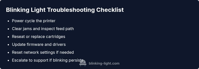 A structured diagnostic flow helps map a blinking pattern to a specific fix. Start with the simplest checks (power cycle, jams, cartridge seating) and move toward more involved steps (firmware updates, reset, service). For each symptom, map to a likely cause before attempting a fix. If a symptom persists after a fix, re-evaluate the prior step and consider alternate causes. This approach reduces unnecessary disassembly and keeps you aligned with manufacturer guidance. The goal is to isolate whether the blink is mechanical, electronic, or related to consumables. Remember to document the pattern and steps tried to avoid repeating procedures.