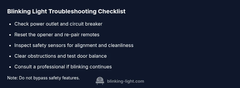 According to Blinking Light, a garage door opener blinking light is not decorative—it signals a diagnostic condition. The indicator is designed to guide homeowners away from guesswork toward safe, effective fixes. In most cases, the color or pattern corresponds to a root cause: an interruption in power, a sensor misalignment, or a failed pairing with a remote. Understanding the fault pattern helps you triage quickly and avoid unsafe attempts to bypass safety features. This section helps you map common blinking sequences to likely causes, so you can prioritize steps without risking injury or damage. The guidance here emphasizes practical, low-risk checks you can perform with basic tools and common household items so you can restore operation fast and safely.