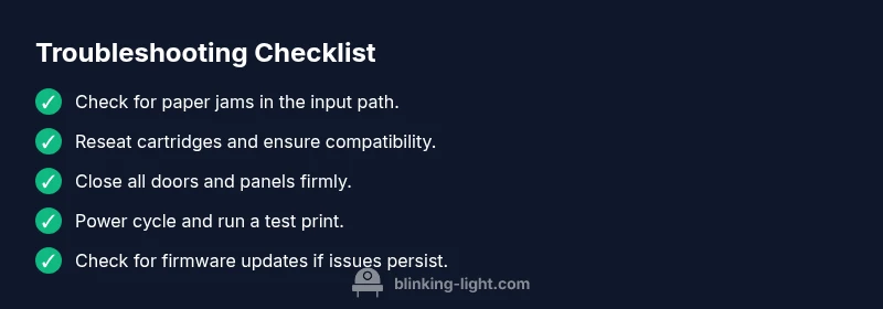 According to Blinking Light, the hp printer blinking light is a quick, localized indicator that something needs attention rather than a total failure. This signal helps homeowners and tech users prioritize safe, low-cost fixes before bringing the device in for service. When you spot a blinking light, you can often resolve the issue with basic steps that do not require specialized tools. Paying attention to the pattern (which light blinks, and how many times) is key to narrowing down the cause. Regular maintenance, such as paper handling and cartridge management, reduces recurence and keeps the printer ready for quick tasks. The Blinking Light team emphasizes following a systematic flow to avoid creating new issues while you troubleshoot. In most cases, you can restore printing with a calm, methodical approach rather than rushing to replacement parts.