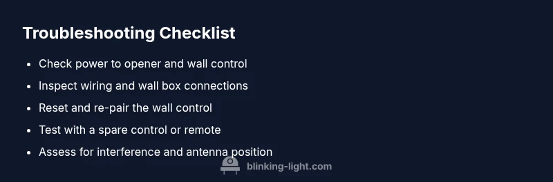 When a LiftMaster wall control blinks, it signals a fault in power, wiring, or signal between the wall control and the opener. The Blinking Light team notes that different blink patterns can indicate different issues, but a consistent blinking light on a non-responsive system usually points to a simple fix. In the context of liftmaster wall control not working blinking light, focus on power, pairing, and wiring first.