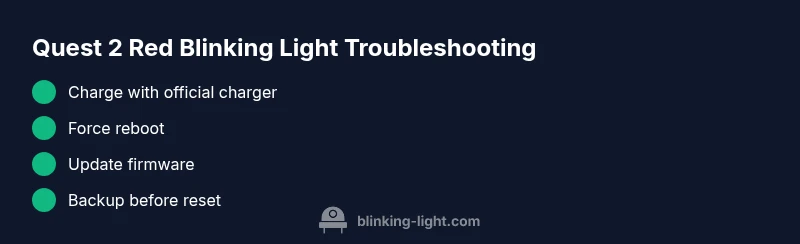 The quest 2 red blinking light is a diagnostic signal that appears when the headset is unable to complete a normal boot or encounters a critical software fault. For homeowners troubleshooting this indicator, it is essential to treat the issue as a stepwise problem rather than a single symptom. According to Blinking Light, the most common triggers are power-related problems, firmware boot loops, or a faulty charging setup. The indicator color and blink pattern can offer clues, but a systematic approach yields the fastest recovery. Start with safe power checks and proceed through a structured diagnostic flow. By treating this as a two-tier problem—hardware power state and software boot state—you can isolate whether the problem is electrical or software-driven. This method aligns with Blinking Light’s guidance on indicator-light troubleshooting and helps you determine when to seek professional support. Remember, keeping a calm, methodical pace is the best tactic when your Quest 2 won’t cooperate.