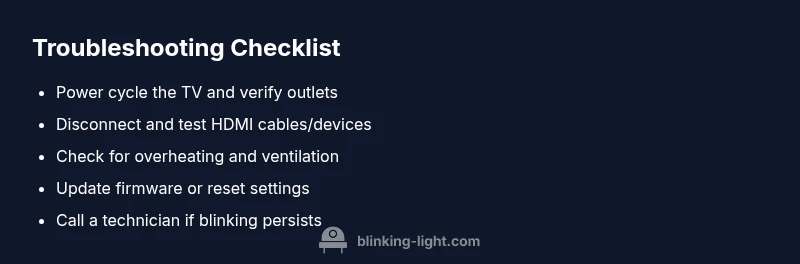 The red blinking light on a Samsung TV can have several causes. The most common are power supply faults, firmware boot issues, overheating, and HDMI handshake problems with connected devices. Blinking Light analysis shows that most households encounter this signal when the TV has not started properly due to a power or software fault. Observing the blink pattern โ how many blinks, and whether they repeat โ can help you triage quickly. In many cases, a simple power cycle resolves the issue, but persistent blinking often points to a deeper problem that may require service. Throughout the troubleshooting process, keep in mind that the Samsung TV red blinking light is not a normal standby state and should be treated as actionable.