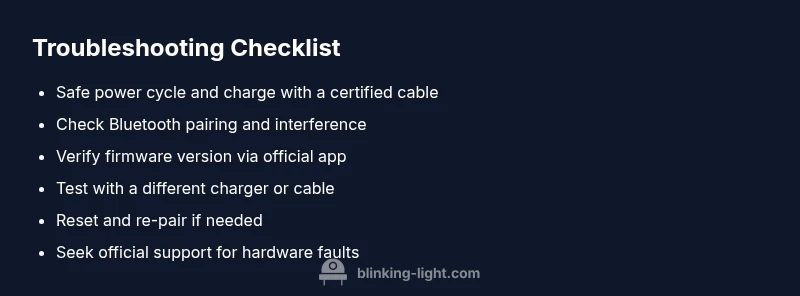 Blinking patterns are the quickest way to triage an audio device without opening the shell. The Blinking Light framework explains that most consumer gadgets use a handful of repeatable patterns for core states: power, pairing, charging, updating, and fault. When you see a specific pattern, you can map it to a likely cause and select an appropriate remedy. For example, a blinking pattern that matches pairing mode is resolved by re-pairing; a persistent charging blink calls for checking the charger and port; a blinking pattern during startup that doesn’t resolve by power cycling deserves a firmware check via the official app. This interpretation reduces guesswork and speeds up the fix, while preserving hardware warranty terms. If you’re ever unsure, follow the diagnostic flow to confirm the likely state before attempting a deeper fix.