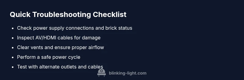 Beneath the blinking light, the most frequent culprits are power supply problems, overheating, and loose cables. A dusty intake or blocked vents can cause thermal throttling, which triggers a fault state. Faulty AV cables or HDMI connections can also mimic a device fault, due to signal loss. In some cases, a minor firmware glitch or corrupted cache can cause instability; a full power cycle can clear it. Blinking Light analysis shows that addressing these areas resolves the majority of home troubleshooting cases.