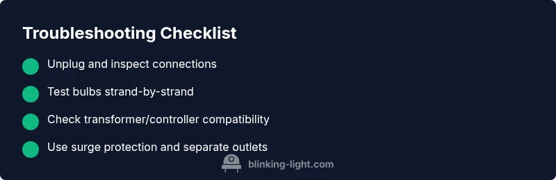 Start with the symptom: do all strands blink, or only a single string flickers? If all strands blink, the issue is likely a power source, transformer, or controller. If only one strand blinks, focus on that string's connections and bulbs. From there, verify each potential cause and apply the corresponding fix in order, documenting what works so you can replicate it next year.
