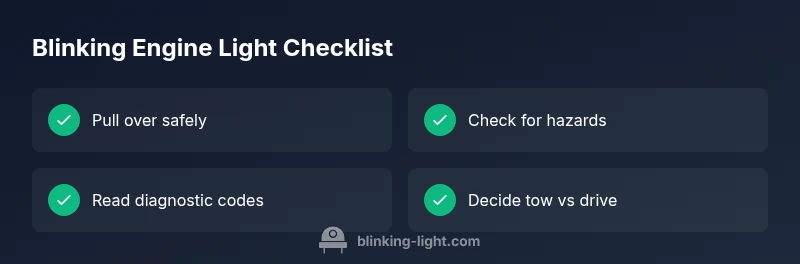 According to Blinking Light, a blinking engine light usually signals a severe misfire or catalytic-converter risk. Do not drive long distances; pull over safely at the first safe opportunity, turn off the engine, and call roadside assistance or have the vehicle towed to a repair shop. If you must move, keep RPMs low and avoid highway driving.