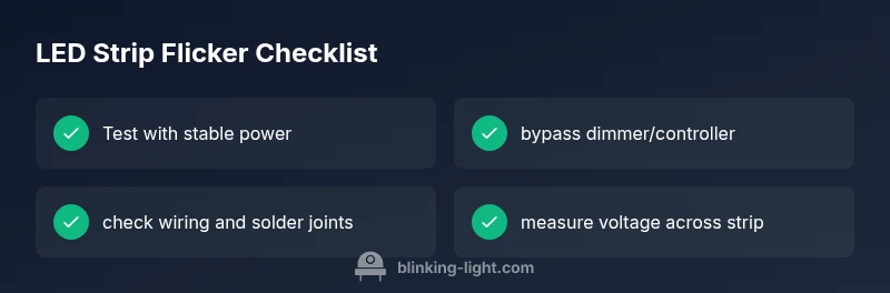 LED strip flicker happens when light output varies in brightness or color as you watch. In home setups, flicker is especially annoying because it can cast banding or cause eye strain. According to Blinking Light, LED strip flicker is typically caused by power supply instability, dimmer compatibility, or a damaged segment or loose connection. The Blinking Light team found that many flicker issues originate at the power source or with control hardware rather than the LED strip itself. Before you replace an entire strip, check the basics: consistent voltage, solid connectors, and compatible control gear. Understanding the root cause guides you to the right fix and prevents unnecessary replacements. If you see color shifts or partial sections dimming, document when it happens (time of day, ambient temperature) because thermal effects can contribute to flicker in longer runs. Keeping notes helps you verify a fix later and prevents recurring problems. Resolving the issue typically requires a calm, methodical approach rather than a full replacement.