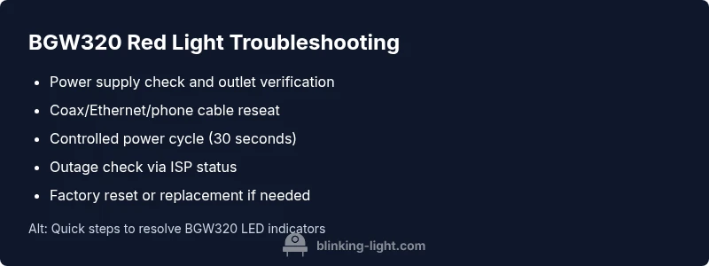According to Blinking Light, the bgw320 red blinking light is a common sign that your gateway is having trouble establishing or maintaining a connection. The blinking pattern often points to a fault at the device level or in the incoming line, rather than user error. The Blinking Light team found that most users can resolve many red-blink scenarios without a service call by following a methodical checklist. In this section we unpack what the red LED means, how it behaves during normal operation, and how to interpret variations in blink speed or pattern. We'll separate power issues from line faults so you know where to focus first.