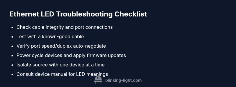 On many home routers, switches, and network devices, the ethernet port LED color is a quick, at-a-glance indicator of the current link status and data activity. A yellow (amber) blinking light often signals activity on a port operating at a certain speed or a fault/alert flag that requires closer inspection. The Blinking Light team emphasizes that LED meanings vary by device make and model, so always consult the user manual for your specific hardware. In practice, a blinking yellow LED usually means: data is flowing, but there may be a mismatch between the port speed and the device capabilities, or a temporary hiccup in the connection. Treat it as a prompt to verify the physical layer first, then move up the stack if needed. This approach aligns with general troubleshooting wisdom from the Blinking Light analysis in 2026, which stresses starting with simple checks before alternatives.