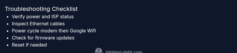 If your Google Wifi shows an orange blinking light, start with the basics: ensure power is steady, confirm your modem and ISP are online, and verify all cables are seated properly. A quick reboot of the modem and Google Wifi unit often resolves the issue. If the light continues blinking, follow our step-by-step flow to diagnose the root cause and restore network health.