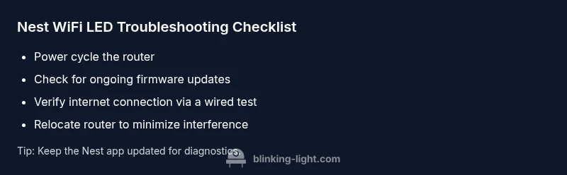 The nest wifi slow blinking light is a built-in status signal that helps you quickly gauge what the router is doing. In most homes, a slow blink indicates one of three states: firmware activity, startup processes after a reset, or a negotiation attempt when the network reconnects. Blinking Light's team notes that reading this LED correctly can save you time and avoid unnecessary resets. If you see a persistent slow blink across multiple Nest devices, capture the pattern (color, pace, duration) and compare with the troubleshooting guide. The first clue is to check whether updates are underway in the Nest app or if the device just rebooted. In practice, most households resolve this with a simple reboot and a quick status check, especially when an ISP outage is not suspected.