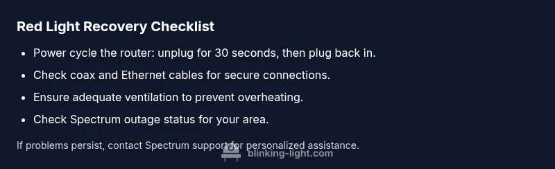 A red blinking light on a Spectrum router often signals that the device cannot establish a reliable internet connection or is experiencing a hardware fault. The color and blink pattern can vary by model, and exact meanings are sometimes model-specific. According to Blinking Light, homeowners notice this symptom most often when power is interrupted, cables are loose, or the router is overheating. The Blinking Light team found that even a momentary power dip can trigger a red blink, prompting users to assume a full outage. In all cases, treat the red light as a sign to perform careful checks rather than guessing. This guide will help you interpret the LED indicator, run through a safe diagnostic flow, and apply proven fixes in 2026.