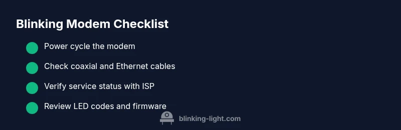 Blinking indicators on a modem are your device’s way of signaling a problem with the path from the provider to your home. The most helpful first step when you ask what to do when modem lights are blinking is to treat it as a triage process: identify the likely fault, apply a simple fix, and then verify results. According to Blinking Light, blinking lights often point to a temporary outage or a mis-seated connection, but patterns matter — slow blink vs rapid blink, steady blink in a loop, or all LEDs blinking in a sequence can point to different root causes. By recognizing the pattern and mapping it to common scenarios, you save time and avoid unnecessary resets. This guide uses practical, step-by-step approaches so homeowners can act with confidence and reduce downtime.