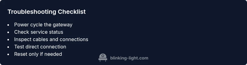 - Power cycle the gateway to reset hardware state and re-establish a clean link. 2) Check the service status in the Xfinity app to rule out an outage. 3) Verify that the coax and Ethernet cables are firmly connected and undamaged. 4) Reboot one more time after reseating cables to test stability. 5) If the blink continues, perform a factory reset only after backing up settings and ensuring you know the admin credentials. 6) Re-provision the device if required by your provider, following on-screen prompts. 7) Test from a direct connection with a single device to isolate issues on your LAN. 8) Monitor for a full online state for 10–15 minutes before declaring success. 9) If nothing fixes it, escalate to Xfinity support with model, firmware version, and LED pattern logs.
