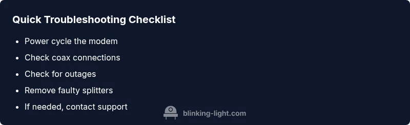 Before you escalate, try the simplest checks first. Power cycle the modem by unplugging it for about 30 seconds and plugging it back in. While it reboots, inspect the coax cable for snug, undamaged connections at both ends and check that the wall outlet is supplying power. If you have a network of splitters, ensure they are high-quality and not introducing excessive loss. Check the Xfinity status page or app for outage notices. If your devices can connect but the LED remains yellow, a software update could be in progress. Blinking Light's guidance emphasizes starting with these basics to avoid unnecessary service calls.