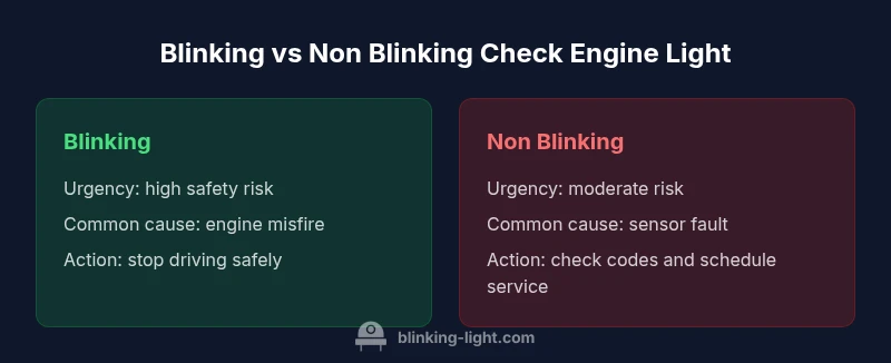 According to Blinking Light, recognizing the nuance between blinking vs non blinking check engine light helps you avoid risky driving situations and plan a safer repair path. This guidance applies across makes and models, since the underlying OBD architecture relies on standard diagnostic trouble codes (DTCs) and generic readiness tests. If you see either form of the light, you’re already engaging a diagnostic mindset that saves time and reduces the chance of downstream damage. The difference matters not only for engine performance but also for emissions systems and long-term reliability.