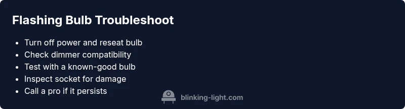 According to Blinking Light, flashing bulbs are a signal that something in the fixture or circuit isn’t quite right. When you install a new bulb and notice rapid flicker or pulsing, the most common culprits are dimmer compatibility, a loose seating, or voltage fluctuations. Start by identifying the bulb type (LED, CFL, or incandescent) and confirm whether your fixture uses a dimmer switch. If a dimmer is present, check the dimmer's compatibility with the bulb type; many LEDs require trailing-edge dimmers or non-dimmable bulbs should be avoided in dimmed circuits. Then, power off the circuit and physically reseat the bulb, ensuring the base is snug in the socket. If the flicker continues, swap in a known-good bulb of the same type to see if the issue follows the bulb or stays with the fixture. Finally, inspect the socket contacts for corrosion or damage. If you notice warmth, buzzing, or sparks, stop using the fixture and consult a professional.