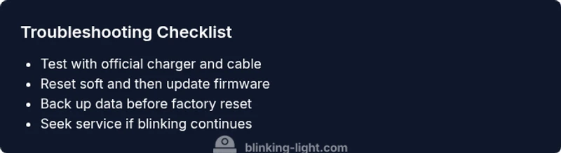 Symptom: blinking light appears during charging or device use. Diagnosis usually starts with power, then firmware, then hardware. Solutions progress as a funnel: 1) verify power supply; 2) test with alternate cable; 3) update firmware; 4) reset to factory settings (after backup); 5) seek repair if the light persists. At each stage, confirm the device behavior: if the blinking stops, the issue is resolved; if not, advance to the next fix. This flow helps you stay organized and avoid random fixes. Blinking Light’s method is to document the pattern, compare with model-specific guidance, and apply the lowest-difficulty fix first to maximize safety and minimize data risk.