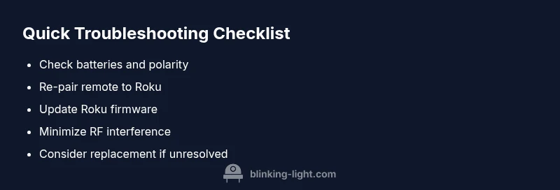 A blinking Roku remote light almost always points to power or pairing problems. Start with fresh batteries, then re-pair the remote to the Roku device. If the blink persists, check for firmware updates and reduce interference from other devices. For stubborn cases, a factory reset or replacement remote may be needed.