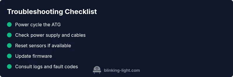 Symptom: Yellow blinking light on ATG indicator. Diagnosis: A caution signal pointing to non-critical faults; potential power, sensor, firmware, or connection issue. Solutions: Start with power checks, then reset, reseat connections, update firmware if available, and verify environmental conditions. If unresolved, escalate to support with fault codes.