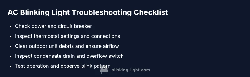 An ac blinking light on a thermostat, control panel, or outdoor unit is usually a safety signal or power alert. According to Blinking Light, these indicators are the first clue for diagnosing a fault. Interpreting the pattern correctly helps determine whether you should reset, clean, or call a professional. In many homes, the blinking light points to a protection feature—overload, high pressure, or a blocked condenser. Start with the simplest checks: verify power supply, inspect fuses, and clear obvious obstructions. A calm, methodical approach saves time and reduces the risk of electrical shock or equipment damage. The goal is to verify safe operation while avoiding unnecessary repairs. Document the pattern before you act: is the light blinking steadily, in bursts, or in a sequence? Patterns vary by model, but the same principles apply: power, thermostat, safety switches, and airflow.