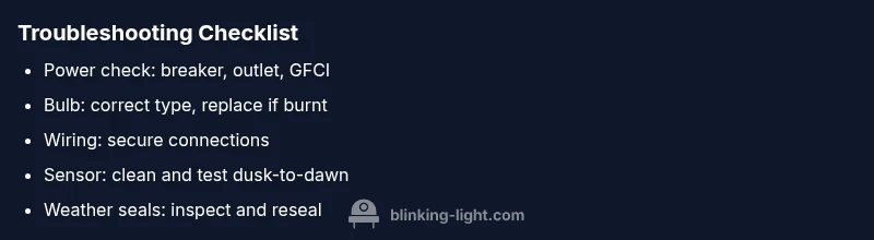 Before you dive into disassembly, run through these quick, safe checks. They require no tools beyond a flashlight and basic safety gear. First, cut power to the fixture at the main breaker or outdoor-rated switch. Then, verify there is zero voltage by testing with a non-contact tester or a multimeter set to AC. Next, inspect the bulb: is it burned out or the wrong type? Replace with the correct wattage and type; avoid overloading the circuit. If replacement doesn’t resolve the issue, check the wiring nuts inside the visible junction box for looseness or corrosion; tighten and reseal as needed. Examine the fixture housing for cracks or water intrusion, especially after rain or snow. For sensors, verify the photocell/sensor face is clean and unobstructed, and test with dusk-to-dawn settings or motion detection modes to see if it responds. If you have a smart controller, confirm the app’s status and ensure the device is included in the correct room or zone. If any step reveals water or damaged insulation, stop and follow safety guidelines; moisture and electricity are a dangerous combination. Document findings to guide the next steps.