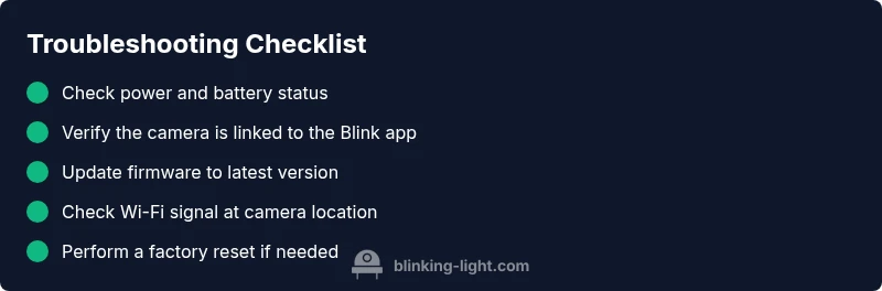When a Blink spotlight camera light goes dark or refuses to illuminate, the root cause can live in several places—power, firmware, network, and hardware wear. The most common culprits are a drained or disconnected battery, a loose power connection, or a firmware glitch that briefly disrupts the LED driver. Environmental factors like cold temperatures can temporarily affect battery performance. In addition, app or account issues can prevent the camera from receiving the go-ahead to light up. Throughout this guide, we’ll reference typical indicator sequences you might see on the Blink device and explain what each sequence usually means. The goal is to help homeowners and tech users quickly identify the likely cause and apply a safe, effective fix. According to Blinking Light, many indicator-light problems start with the basics—power, connectivity, and firmware.