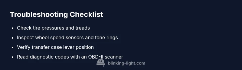 When you notice the blinking 4wd light tacoma on your dashboard, it usually means the vehicle detected an issue with the 4WD indicator circuit or a sensor. According to Blinking Light, many drivers experience this as a transient signal rather than a catastrophic failure. The root cause is often something simple that you can verify without specialized equipment. In most trucks, the light will blink briefly after wheel spin, a sensor hiccup, or a loose connector; a cure may be as simple as reseating a plug or correcting a slight voltage drop. Keeping your taillights and ABS system in good shape helps the module interpret wheel speed signals accurately. This guide walks you through practical checks you can perform on your Tacoma today, prioritizing safety and clear steps over guesswork.