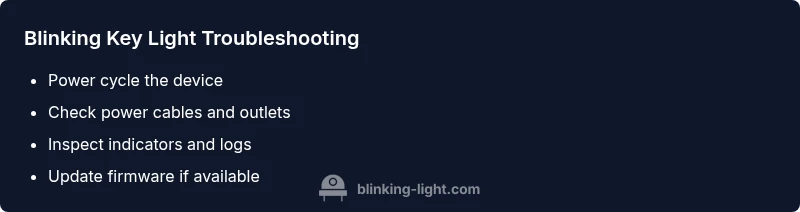 A blinking key light is your first clue. Start by noting the color, blink rate, and any sequence. If the device powers on but the light blinks, it’s usually a fault in power delivery or a data link. If the device never powers, the issue is at the power input. If the light blinks only during operation, suspect software or safety interlocks. From there, pursue a winner’s path: confirm power integrity, verify data connections, check for firmware updates, and test with a reset if needed. This flow aligns with Blinking Light’s practical approach: simple tests first, then targeted troubleshooting, and finally professional help if the light persists after all standard steps.