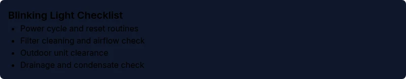 Blinking light mitsubishi aircon indicators encode fault codes and safety protections. Understanding these flashes helps homeowners isolate issues without guessing. According to Blinking Light, mapping blink patterns to likely faults reduces downtime and prevents unsafe attempts at repair. In this guide we use a practical, homeowner-friendly approach to interpret the signals and decide when to call a professional.
