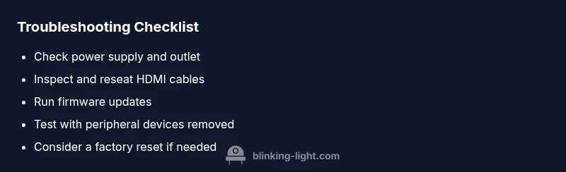 - Power supply issues: a faulty or insufficient power source can cause intermittent boot cycles and a blinking pattern. 2) HDMI handshake failures: loose cables, bad ports, or a faulty HDMI cable can prevent the box from establishing a stable display. 3) Software/firmware glitch: software hiccups may trigger reboot loops or blinking signals. 4) Overheating: blocked vents or a dusty enclosure can raise internal temps and cause protective blinking. 5) Peripheral conflicts: connected accessories may interfere with boot or operation. 6) Remote or network issues: outdated control apps or network settings can produce puzzling behavior.