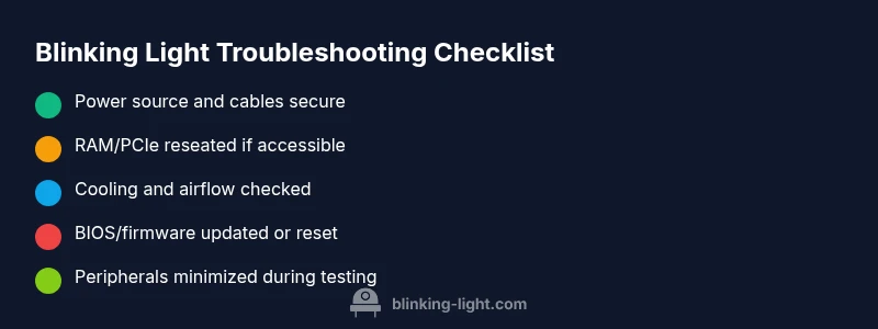 Most blinking lights on a computer signal power or hardware status. The quickest fix is to safely power down, unplug, reseat removable components if you’re comfortable, check cables, and verify cooling before rebooting. If the light reappears after a clean restart, consult the device manual for POST codes or contact support. Blinking Light recommends documenting codes and symptoms to speed up diagnostics.