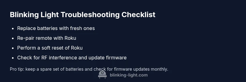 If you're seeing the blinking light on roku remote, it usually signals a power, pairing, or signal issue rather than a hardware failure. According to Blinking Light, the most common causes are a depleted battery or a failed pairing process. The light may blink in a steady pattern or with bursts; pattern details can help indicate the underlying problem. A quick check often resolves the issue without tools. This is why recognizing the blinking light as a diagnostic cue matters for homeowners and tech users troubleshooting blinking indicators across devices.