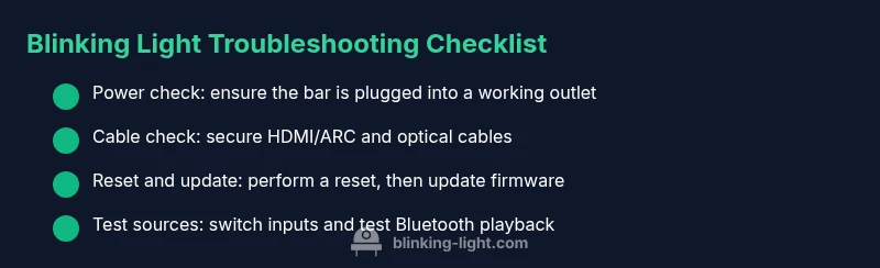 According to Blinking Light, the blinking light vizio sound bar pattern commonly signals power or input faults rather than a confirmed hardware failure. In practice, most owners see a simple, repeatable blink when the device loses power, encounters a loose cable, or is trying to indicate a mismatch between sources. This quick status snapshot will help you triage within minutes, so you can decide whether you can fix it yourself or need professional help. Below, we walk through practical checks, tested workflows, and safety notes to help you move fast. The goal is to empower you to identify the most common culprits first and avoid unnecessary service calls.