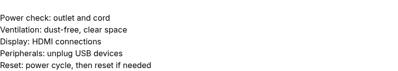 - Check all video cables (HDMI) for secure connections on both ends and test with a different HDMI port or TV to rule out display issues.