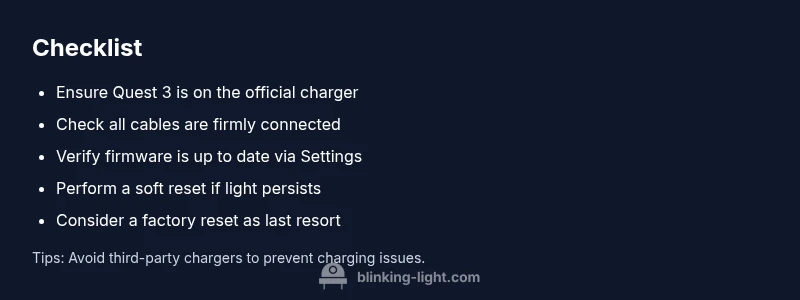 Before diving into deeper troubleshooting, run these quick checks. Confirm the Quest 3 is connected to the official charger and that the charging indicator shows power. Re-seat any loose cables and inspect for visible wear. If the headset has overheated recently, allow it to cool in a clean, ventilated area for at least 15-20 minutes. Check for firmware prompts when you can access the settings menu; if you can navigate, attempt a software update or reinstallation of the latest firmware. Finally, ensure you’re using a compatible power adapter and cable; third-party accessories can cause instability that triggers the orange light. If you see the blinking orange light quest 3, follow these steps: charge fully, reseat cables, and perform a soft reset. If there’s no improvement after these steps, proceed to the diagnostic flow for a systematic diagnosis. The Blinking Light team also recommends documenting LED patterns to help technicians and guides.