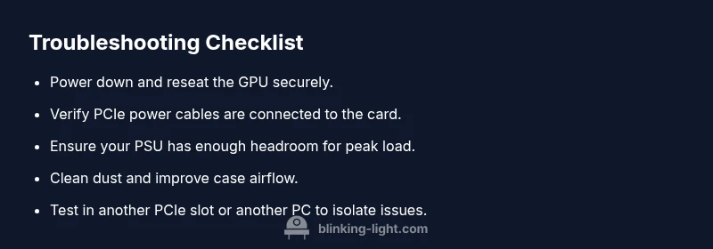 Here is a pragmatic path to diagnose the blinking red light. Start with power and seating: ensure the PSU is supplying adequate current and that the GPU is firmly seated with all connectors engaged. If symptoms persist, check cooling: verify fans spin and airflow is unobstructed, then monitor temperatures when the system is running. If the light still blinks, test the card in another PCIe slot or another PC to rule out motherboard faults. Firmware and driver updates are considered after hardware checks. If none of these steps resolves the issue, professional evaluation is recommended.