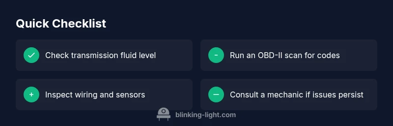 Symptom: A blinking transmission light appears on the dash while driving. Diagnosis: Is the fluid level correct? Are there leaks? Do codes indicate a specific fault like a sensor, solenoid, or overheating? Fixes: Top up fluid if low and address leaks; run a codes check and inspect wiring; if codes indicate a transmisssion fault or the light remains after basic steps, seek professional service. For overheating or imminent failures, avoid driving and call for roadside assistance.