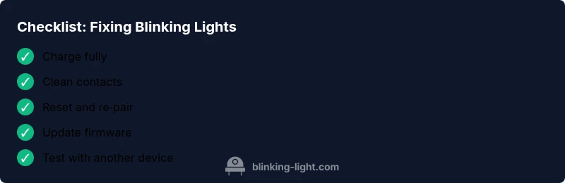 If you still see a blinking light after the above steps, follow a structured diagnostic path: (1) confirm full charge and clean contacts; (2) perform a reset and re‑pair; (3) test with a different device and different app/version if available; (4) update firmware; (5) contact support if blinking persists. Document the pattern, when it occurs, and what you tried. If there is any sign of moisture ingress or physical damage, stop using the device and seek professional service. Safety first: avoid using damaged electronics near water, unplug charging sources before cleaning, and do not attempt disassembly.