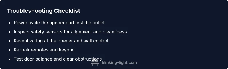 Begin with the simplest checks and move to more involved steps only as needed. First, confirm the opener and wall control have power and that the power outlet is delivering electricity (test with another device if needed). Next, inspect the door’s safety sensors for misalignment or debris on the sensor faces. A common misalignment causes a blinking code that disappears once the sensors face each other within the permissible gap. If the sensors are clean and aligned, test the remote control and keypad, ensuring batteries are fresh and the devices are properly paired with the opener. If you still see blinking after these steps, check the door balance and track obstructions. End by resetting the opener and re-pairing remotes and keypads. This flow minimizes risk while guiding you toward the most likely causes.